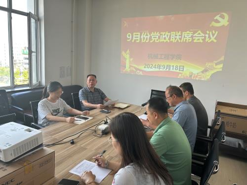 9月18日下午1:30,机械工程学院9月份党政联席会议在A508召开,学院领导班子成员参加本次会议,会议由党总支书记周宇明主持。