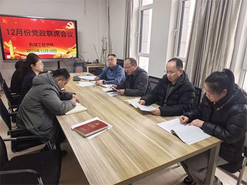12月10日下午,机械工程学院12月份党政联席会议在A505召开,学院领导班子成员参会,会议由党总支书记周宇明主持。